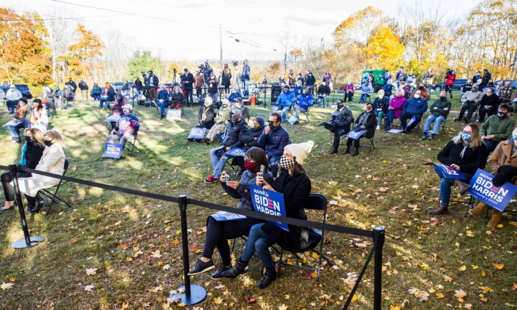 Tuesday’s event in Bangor was a stark departure from Trump campaign events. Everyone wore a mask and was distanced, and organizers limited the number of people to about 100 to fall within the guidelines for gatherings set by Gov. Janet Mills.