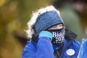A Biden supporter tries to stay warm during a campaign rally at the Thomas Hill Standpipe in Bangor on Wednesday. Michael G. Seamans/Morning Sentinel