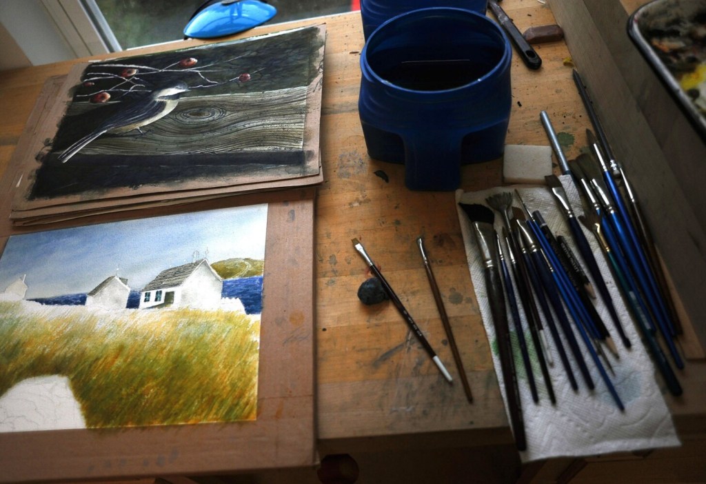 Lowe spends two hours there every other day painting watercolors atop a desk he built from “scrap lumber I couldn’t throw in the wood stove.”