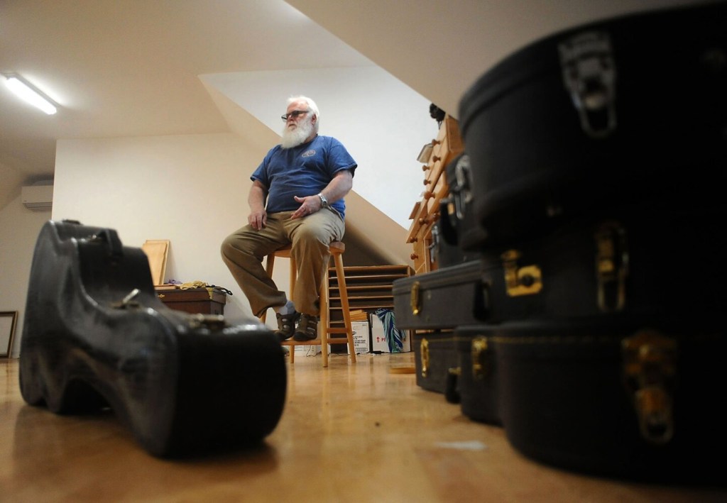 Craig Lowe, 69, is surrounded by guitar cases as he talks Wednesday about his watercolor paintings at the studio and house he built in Unity. Rich Abrahamson/Morning Sentinel Buy this Photo