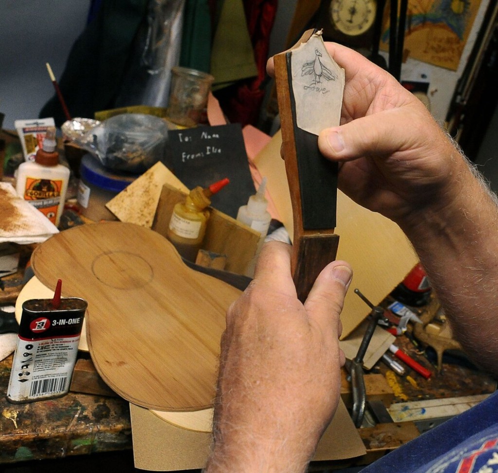 Craig Lowe explains the design of a ukulele he is making at his house and workshop in Unity. Rich Abrahamson/Morning Sentinel Buy this Photo