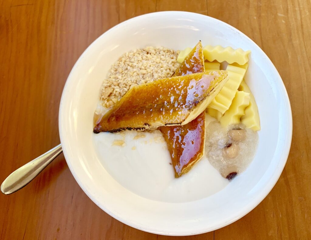 Creamy, starchy, comforting and texturally vibrant, this dessert staple comprises three layers: a pudding-like base of sticky rice and black-eyed peas, a coconut-milk sauce, and a crunchy, nutty topping. It can be served hot or cold, but at CTB, we serve it cold during the thawing months with a brûléed banana and passionfruit jellies.