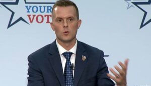 Screen shot of U.S. Rep. Jared Golden at Maine Public’s 2nd District congressional debate last month in Augusta.