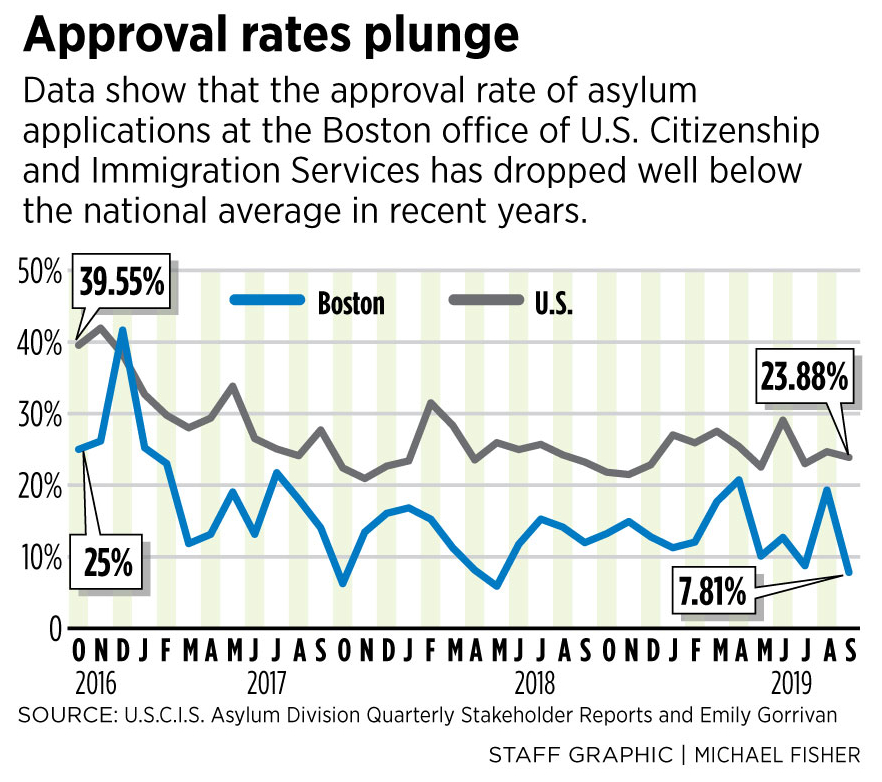 The Boston immigration court is more likely to grant an application for asylum than the regional office. Data compiled by Syracuse University shows that the Boston immigration court granted asylum to nearly half – 572 of 1,287 – of its cases in 2019. The national approval rate for all immigration courts was less that year – 30 percent, or 19,920 out of 67,625.