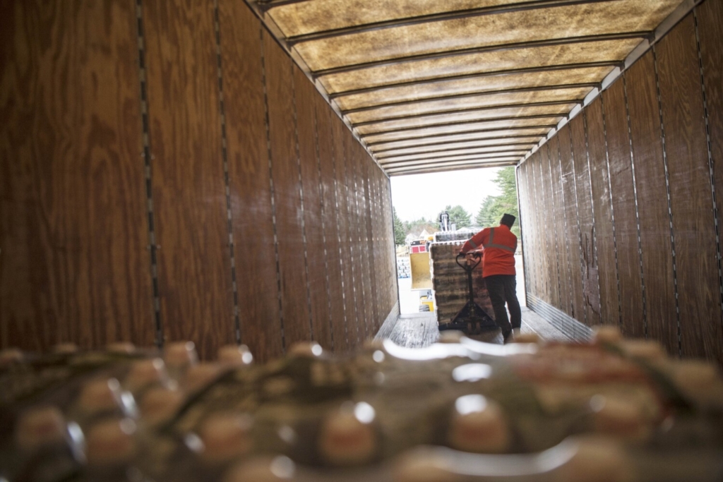 Jeff Keene unloads a pallet of water Nov. 13 as Poland Spring delivers 1,080 cases of water to the Skowhegan Community Center for distribution to residents. Michael G. Seamans/Morning Sentinel Buy this Photo