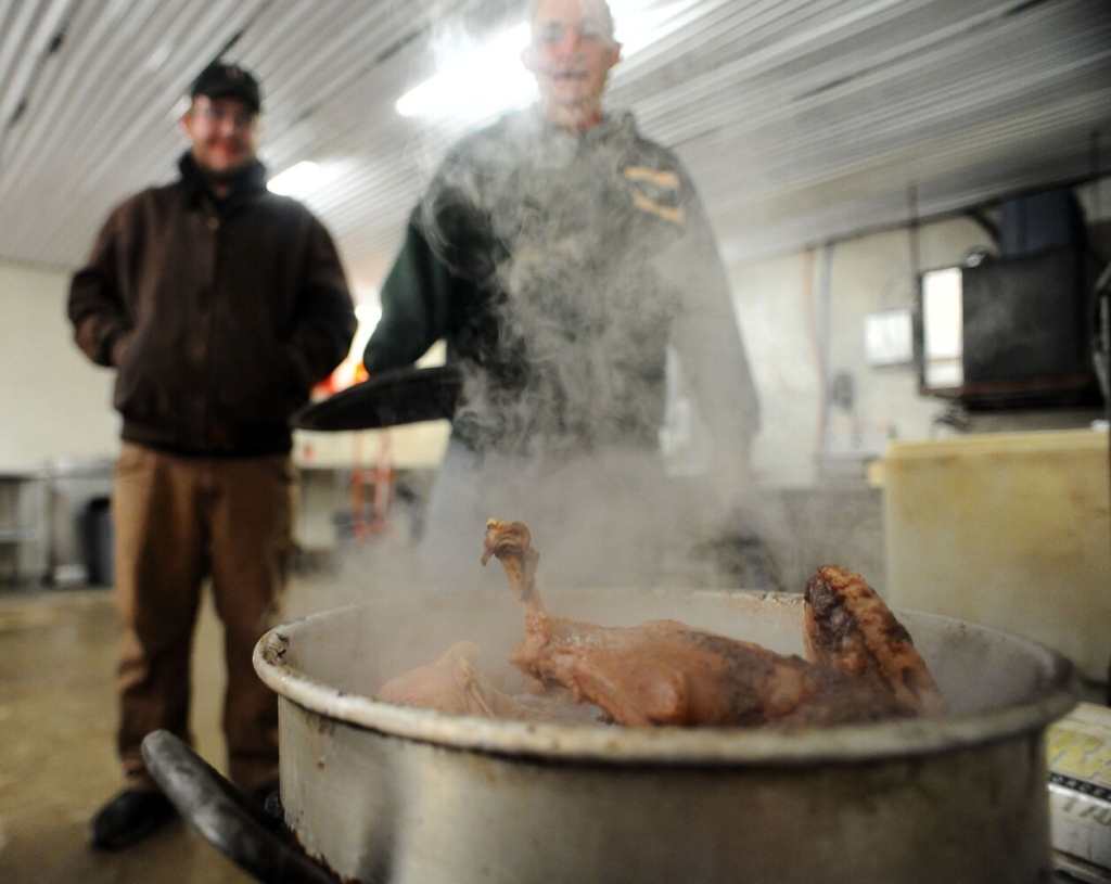 Scott Greaney of Greaney Turkey Farm, uncovers a pot where a turkey boiled at the farm in Mercer Nov. 18. Greaney is shown next to his son Ben, who helps operate the business which began in 1983. The farm is handling twice the amount of turkey processing business this year, according to Scott Greaney. Rich Abrahamson/Morning Sentinel Buy this Photo