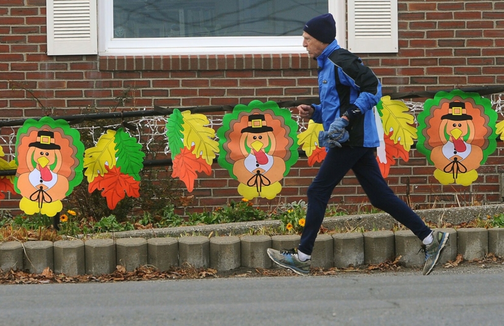 A runner passes Thanksgiving decorations Nov. 17 at the Mid-Maine Chamber of Commerce in Waterville. Rich Abrahamson/Morning Sentinel Buy this Photo