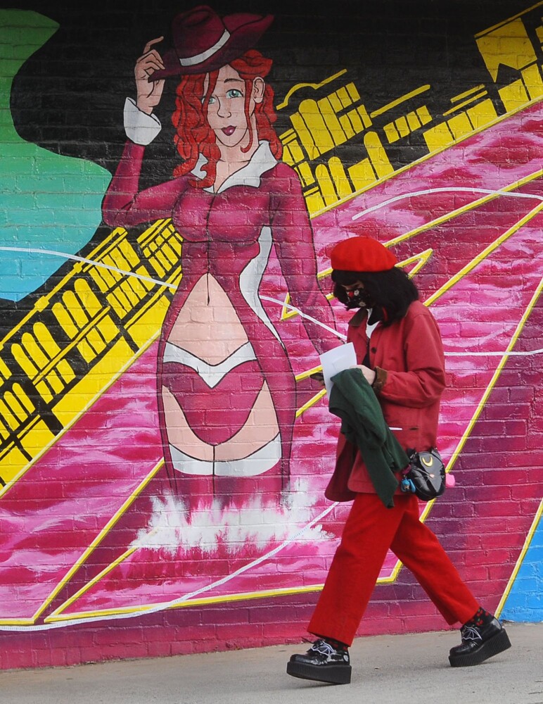 A pedestrian passes the mural that covers the wall next to the Concourse entrance to The Framemakers in downtown Waterville Nov. 19. Rich Abrahamson/Morning Sentinel Buy this Photo