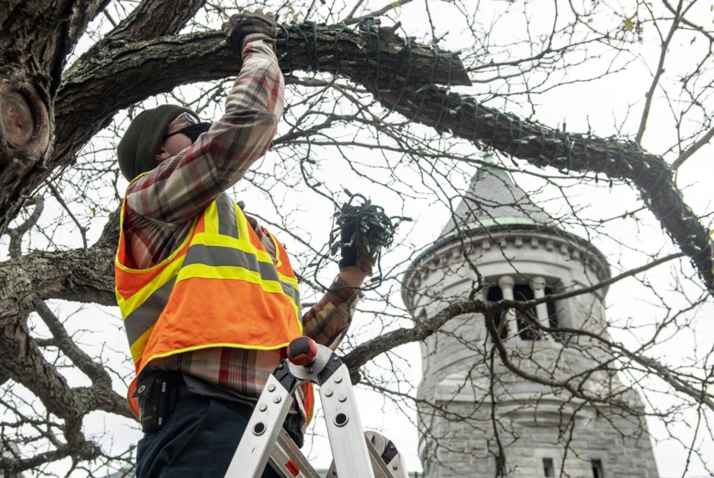 Augusta city employee Robert Emerson wraps Christmas lights around a tree limb Nov. 13 near the Olde Federal Building in Augusta. City workers are decorating for the holidays and a large Christmas tree will be moved into Market Square this weekend. Joe Phelan/Kennebec Journal Buy this Photo
