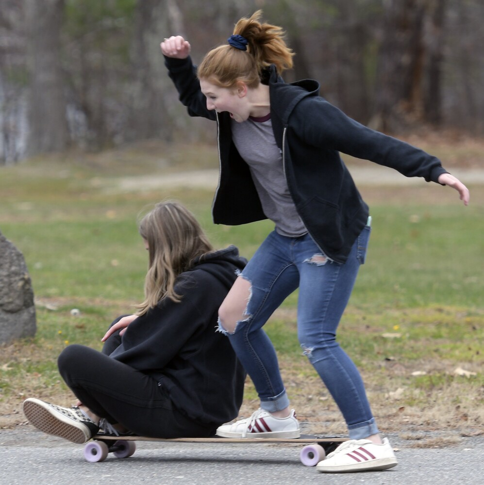 Amber Hand, right, pushes Haley DeHahn on a longboard Nov. 15 near their homes in Monmouth. The first year students at Monmouth Academy were playing together on a cool but overcast day. Andy Molloy/Kennebec Journal Buy this Photo