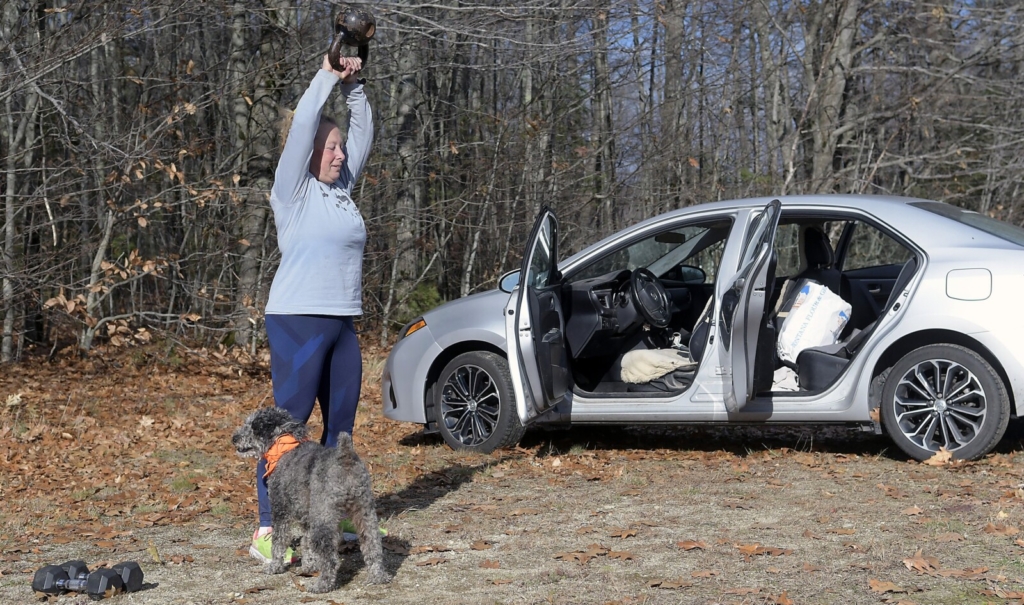 Tinker Mickalide works out with a kettlebell Nov. 16 near her home in Litchfield. The baker said she likes to combine running with her dog and weight training outside three times a week. Andy Molloy/Kennebec Journal Buy this Photo