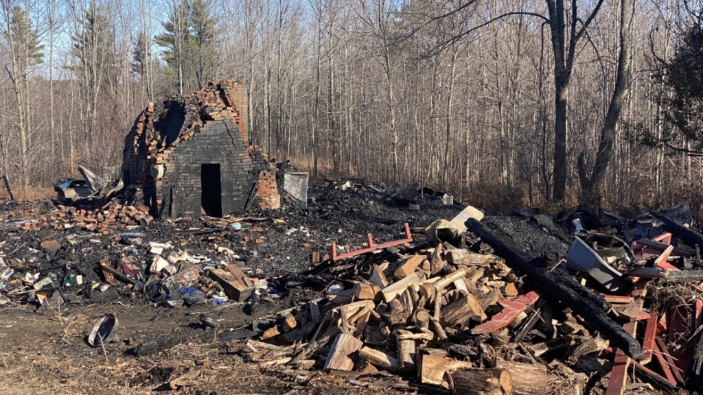 Charred debris litters the ground where homeowner Shaina Shaylin-Begin, 59, of 198 Mile Hill Road in New Sharon died in a fire Saturday. Her identity was released Tuesday by state investigators. Russ Dillingham/Sun Journal