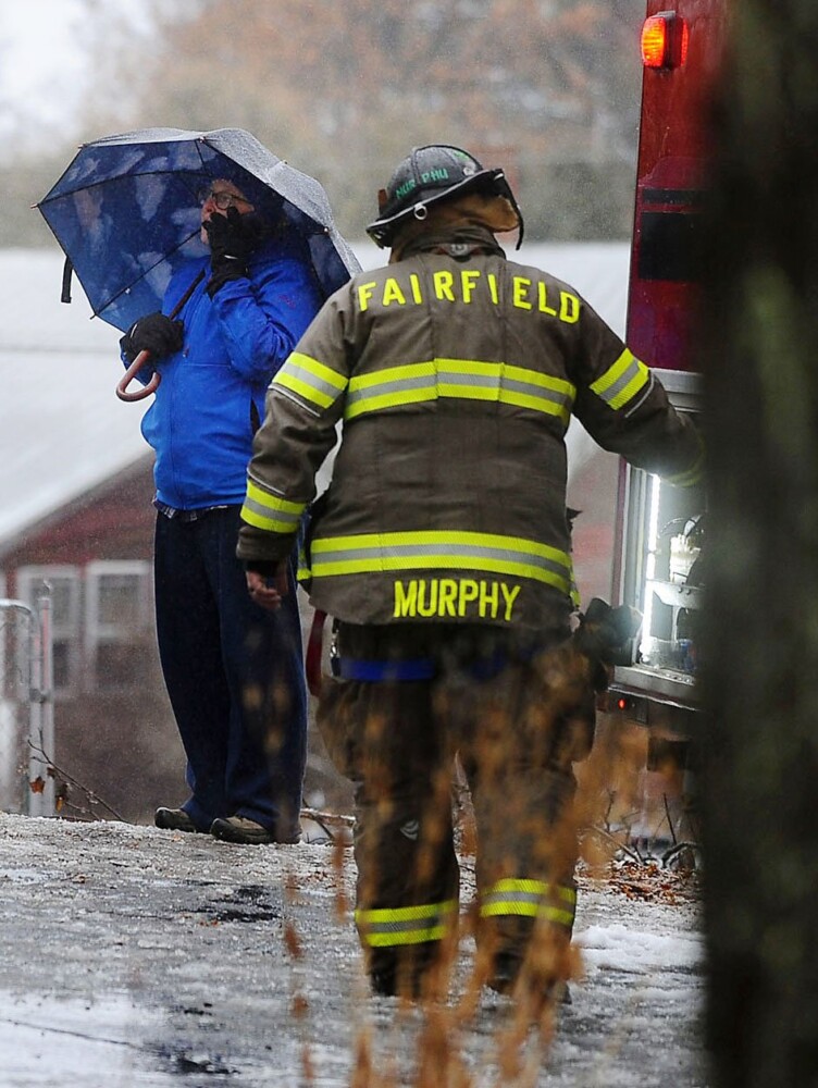 Beth Froman talks on the telephone and shelters from the rain Thursday after her home in Fairfield was damaged in a chimney fire. Fairfield firefighter Mike Murphy, right, said the fire extended to the second floor walls. Froman, who shares the house with her two daughters, said she would need to stay at a motel for a couple nights. Buy this Photo