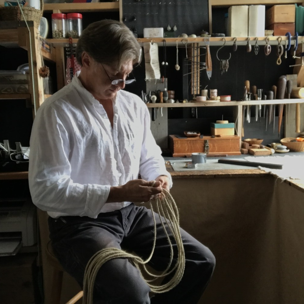 Tim Whitten of Deer Isle (Belvedere Craft) identifies his area of work as marlinespike craft, which encompasses a broad range of weaving, braiding, knotting and sewing skills. The pieces that he makes are practical in function but sculptural in form.