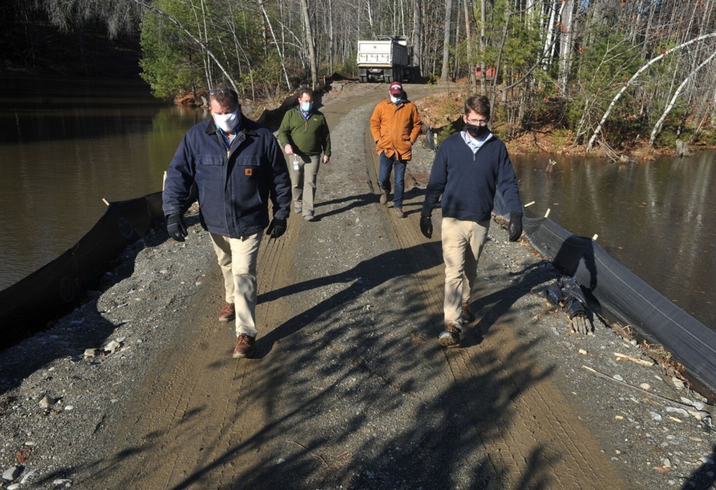 From left, Mike Poulin, Mark Vannoy, Mark Robinson and Mike Cummons pass the lower pond, left, Wednesday at Maine Water in Skowhegan. The men toured a dam that is being refurbished at the facility. Poulin, Vannoy and Cummons are with Maine Water, while Robinson is a consultant for Maine Water. Rich Abrahamson/Morning Sentinel Buy this Photo