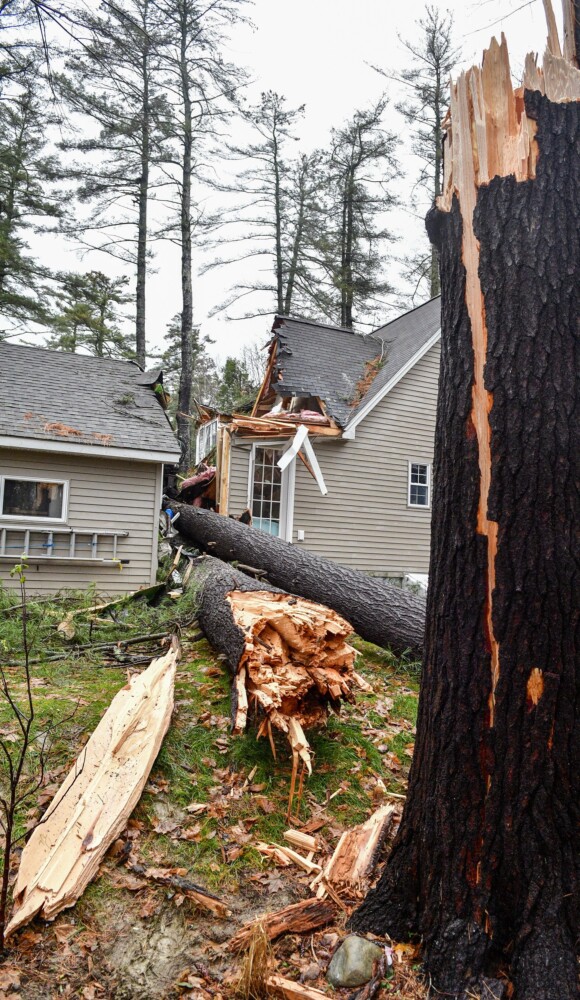 A view on Tuesday of the two trees that crashed into a home in Manchester during a windy storm on Monday night. Joe Phelan/Kennebec Journal Buy this Photo