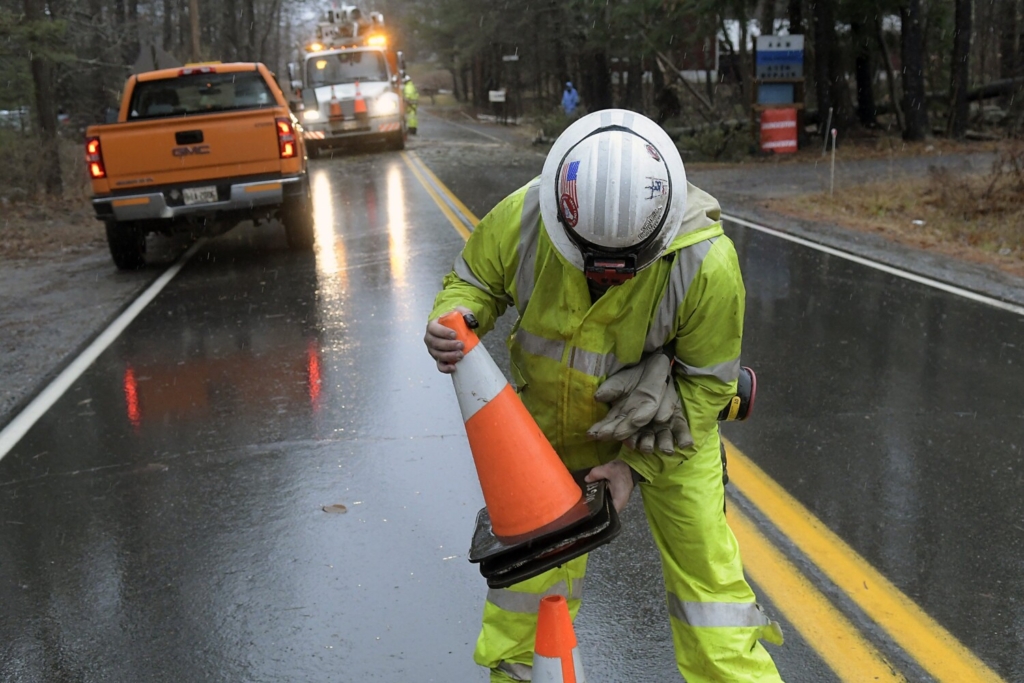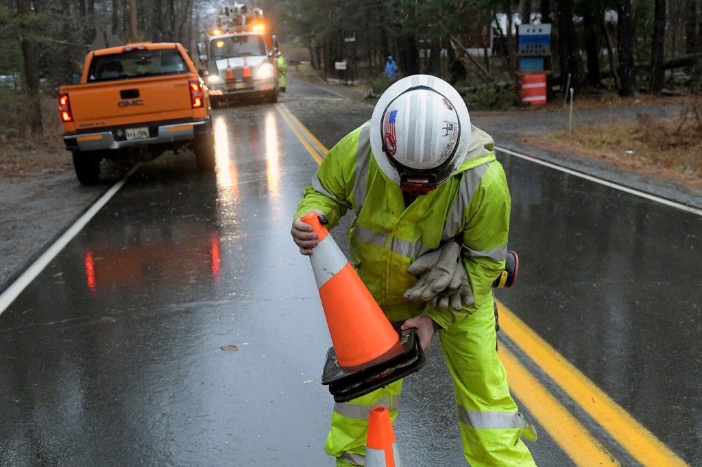 George Marston, a lineman with Central Maine Power Co., stacks cones Tuesday after restoring power in West Gardiner. Andy Molloy/Kennebec Journal