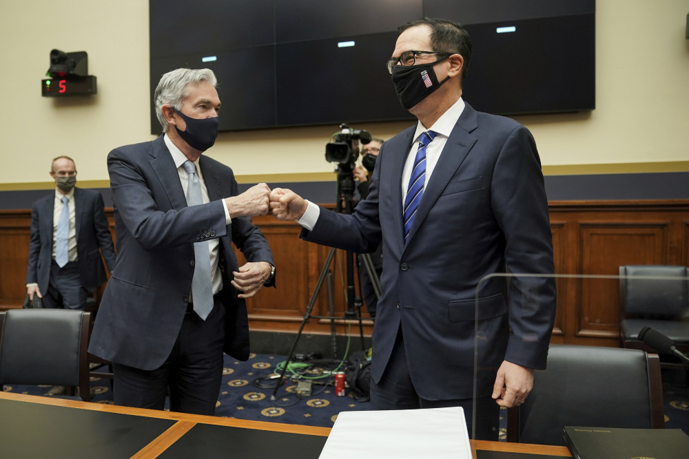 Federal Reserve Chairman Jerome Powell, left, fist-bumps Treasury Secretary Steven Mnuchin after a House Financial Services Committee hearing Wednesday on Capitol Hill in Washington. Greg Nash/Pool via AP