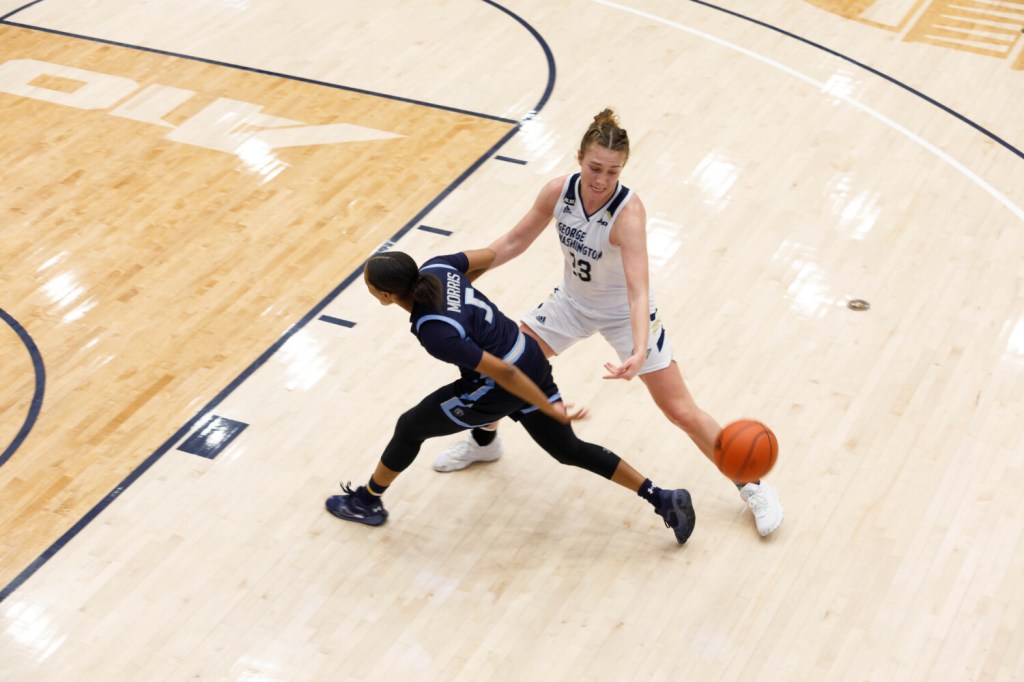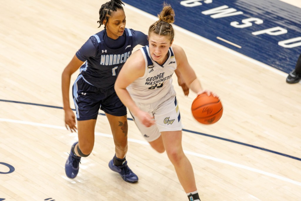 George Washington University sophomore forward Faith Blethen keeps her eyes on the ball behind Old Dominion guard Victoria Morris during a Nov. 28 game in Washington, D.C. Blethen, a Boothbay graduate, has started all three games for the Colonials. Photo provided by William Atkins/George Washington athletics
