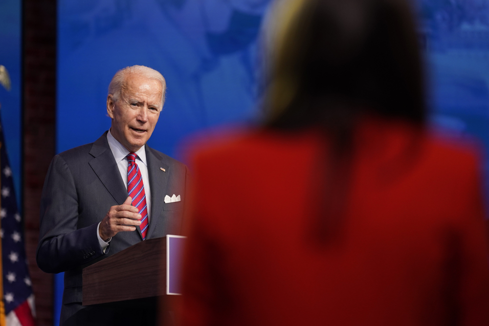 President-elect Joe Biden talks to reporters Friday at The Queen theater in Wilmington, Del. Andrew Harnik/Associated Press