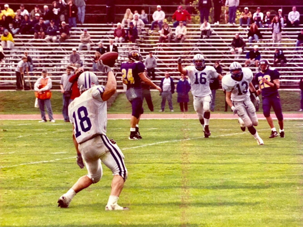 Colby College wide receiver Danny Noyes celebrates a touchdown in the 2000 season opener at Williams College in Williamstown, Massachusetts. Photo provided by Colby College