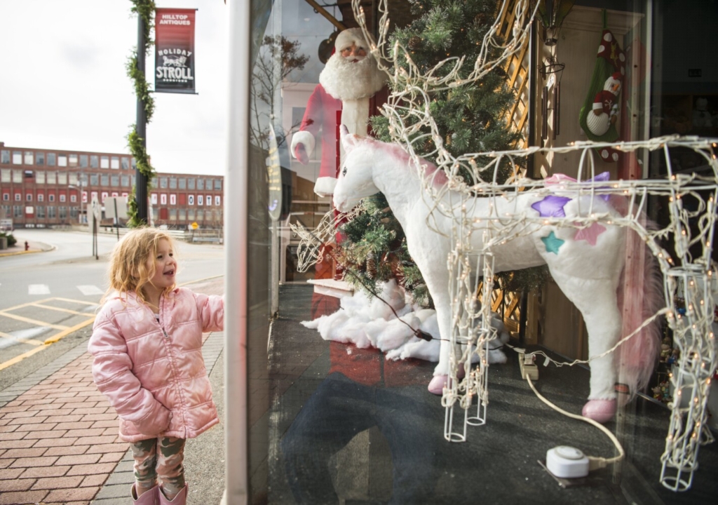 Adriana Johnson, 4, of Canaan stands outside the window display of a Santa Claus and a unicorn at Lynette’s Cards and Gifts during the 25th annual Holiday Stroll in downtown Skowhegan on Dec. 2, 2017. The 2020 Holiday Stroll has been postponed because of the coronavirus pandemic, but other holiday-themed events are planned instead. Michael G. Seamans/Morning Sentinel file