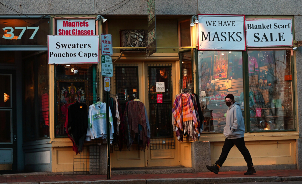 A pedestrian walks past a store in the Old Port on Dec. 11. Gov. Janet Mills signed an executive order that day requiring businesses and public spaces of any size and for any number of people to mandate mask wearing. Shawn Patrick Ouellette/Staff Photographer