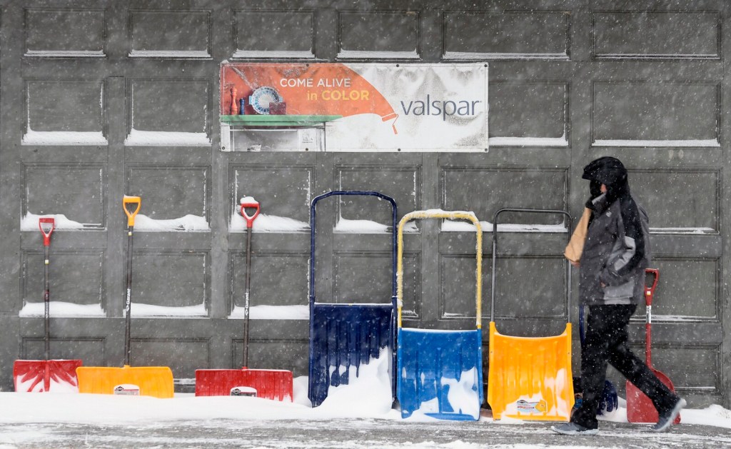 Shovels await shovelers Thursday outside of Harvey’s Hardware in Gardiner during the first major snow storm of the winter season. Andy Molloy/Kennebec Journal