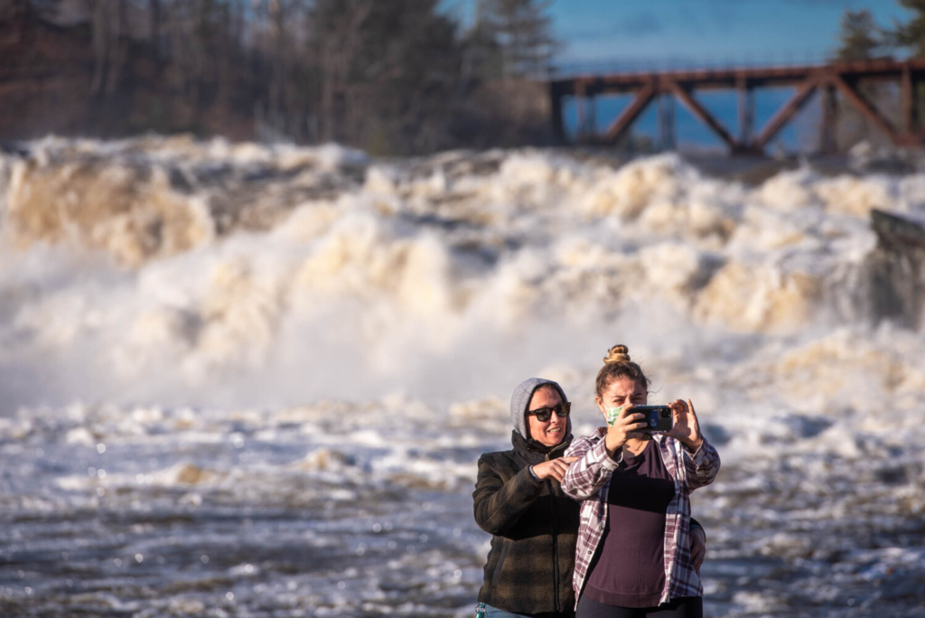 Anna Stavrou, left, and her daughter, Nadia, from New Hampshire, take a selfie Saturday in front of Great Falls in Lewiston while standing in Veterans Memorial Park. Stravou, who lives in New Hampshire, but whose work often brings her to Lewiston, took the trip with her daughter to see the falls after the heavy Christmas Day rainfall. “It’s better than Niagara (Falls) because it’s so close,” Nadia said. Andree Kehn/Sun Journal Buy this Photo