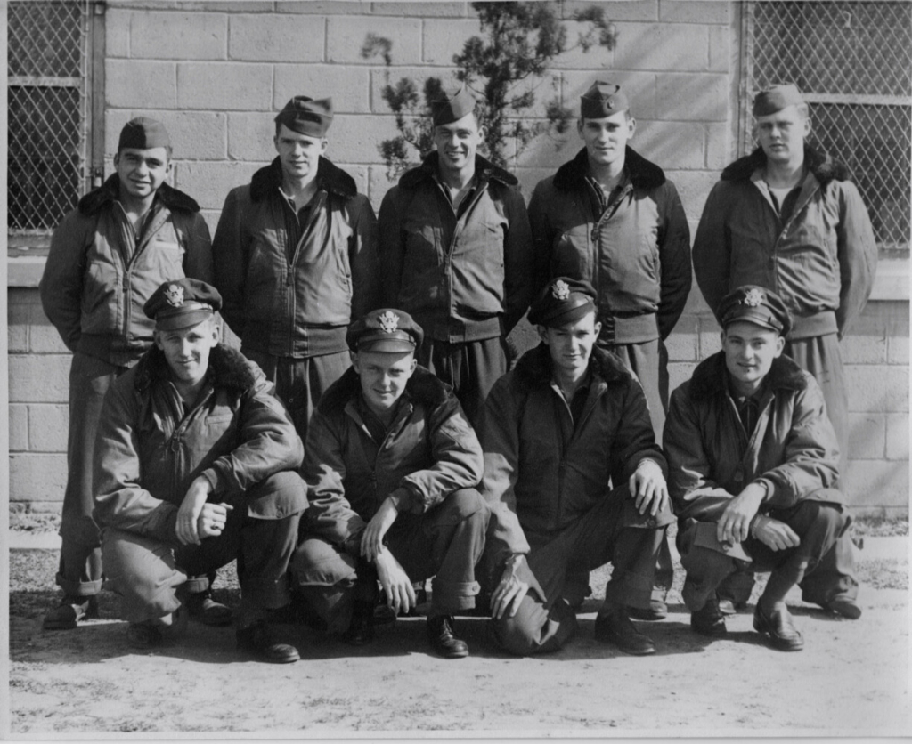 Pilot Roger W. Sundin is on the left, front row, in this photo of the B-17 crew. Frank G. Thompson, radio operator, is second from right in the back row. Thompson wrote letters home and often mentioned his pilot, Sundin, which led his daughter to Sundin, now 97 years old. Photo courtesy of Roger Sundin Jr.