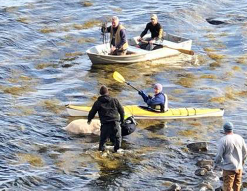 Kayaker Jerri Holmes and other rescuers corral the escaped goat and steer it back to the shore of Belfast Bay Dec. 29. Photo courtesy of Linda Ronan