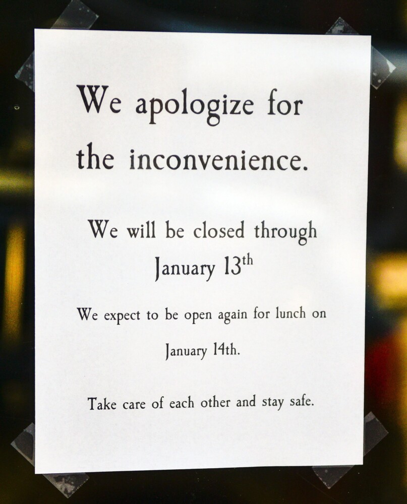 “It is with the communal heavy heart that we must announce we will close for the next week. We have always believed in following the science. However, sometimes science and protocol is not enough. Given that we have had positive COVID cases among customers and staff, as well as how many are in our greater community, our Public House will close the doors today, January 7. We have required our full staff to get tested. We expect to reopen on Thursday January 14th. Until then, please take good care of each other, wash your hands, and stay safe.”
