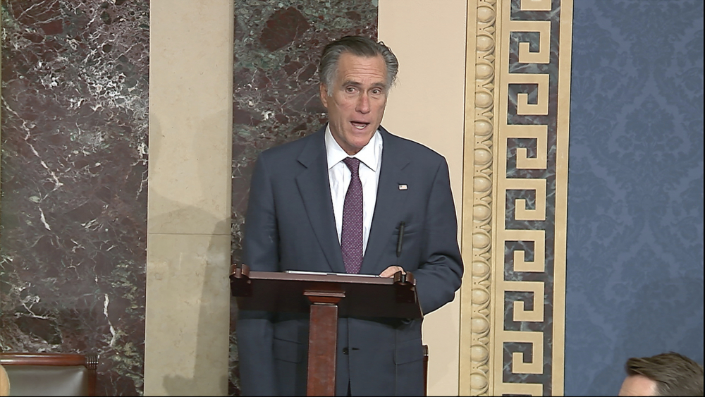 Sen. Mitt Romney, R-Utah, speaks on the Senate floor Wednesday night during the debate on objections to the Electoral College vote from Arizona. Romney, a longtime critic of President Trump, was joined in his criticism of Trump by many Republicans who spent years tiptoeing around Trump’s often-scandalous behavior. Senate Television via AP