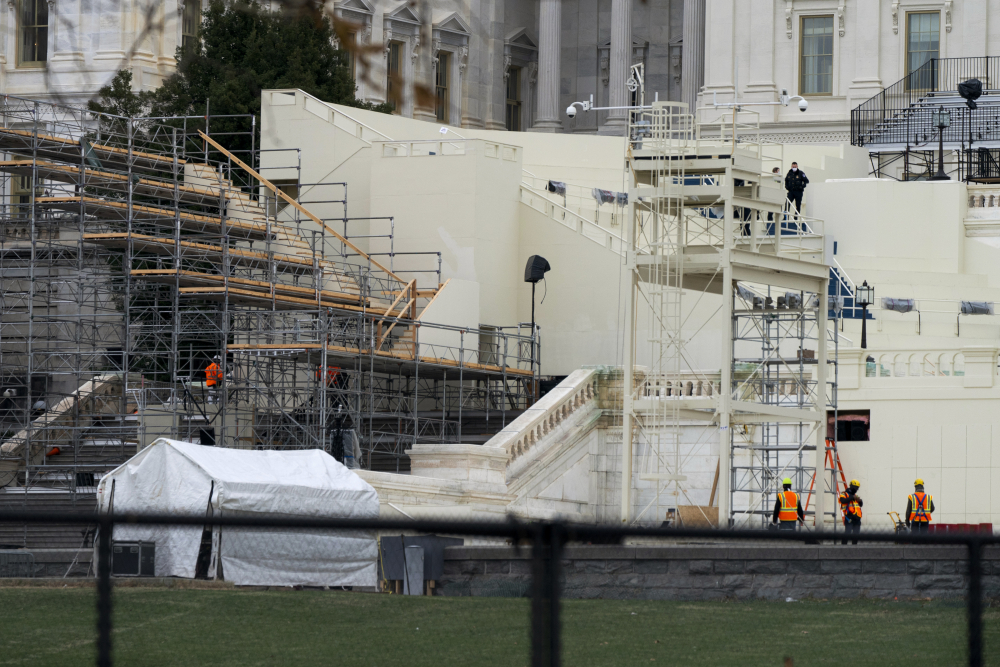 Seen over new security fencing at bottom, workers on Friday fix inaugural stands and platforms at the U.S. Capitol that were damaged in Wednesday’s riot. Jacquelyn Martin/Associated Press