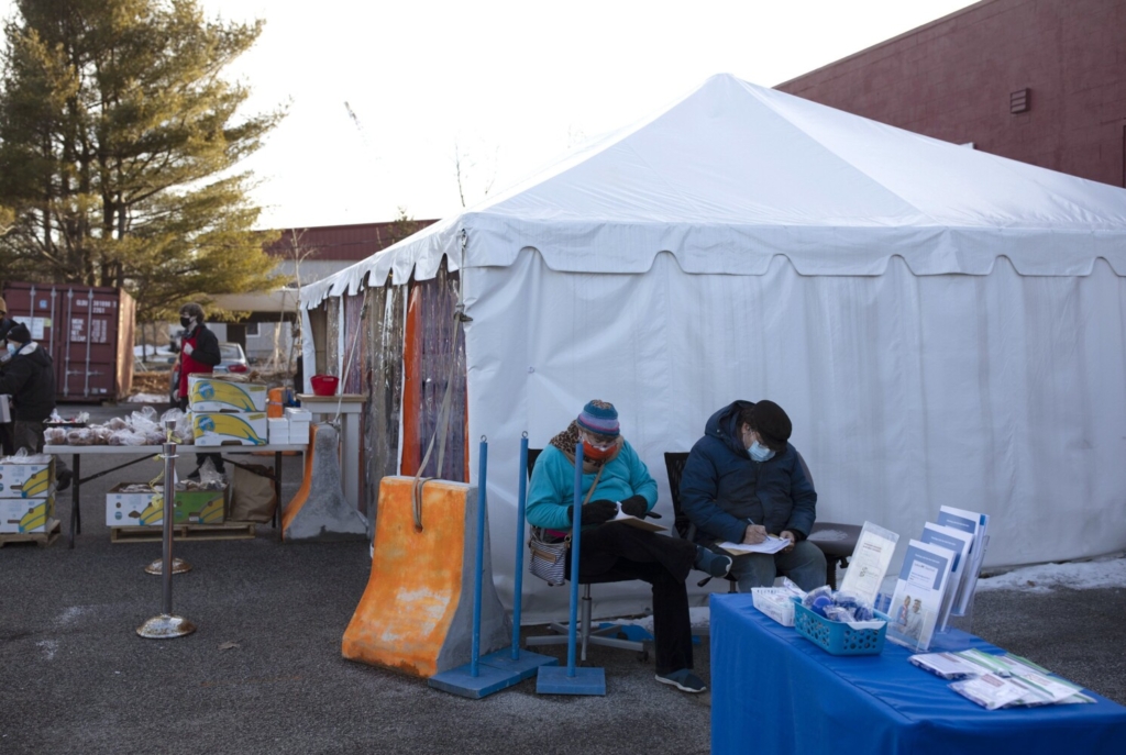 Since the start of the pandemic, the food pantry has changed its model to minimize contact between clients and volunteers. Clients now back their cars into the driveway and volunteers load an average of 17 bags of groceries per family into trunks. Inside a heated tent, clients can pick out extra food from a table that this week included bags of rice, herbs, cooking oil, spices and pet food.