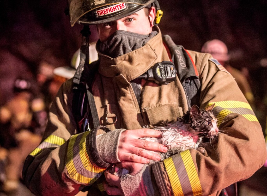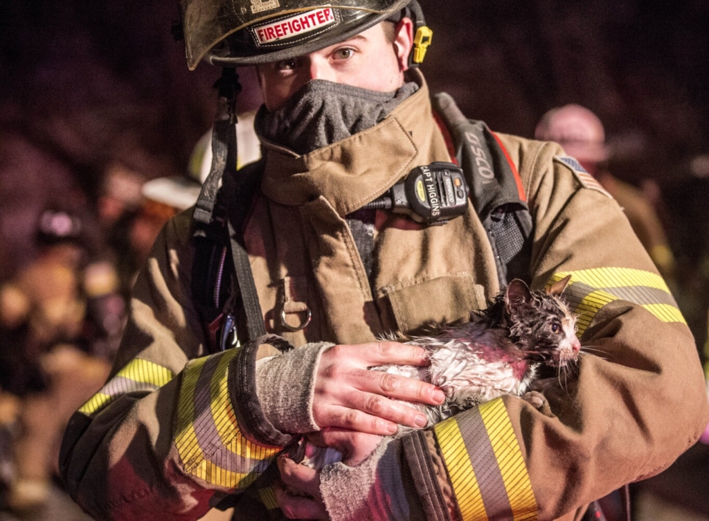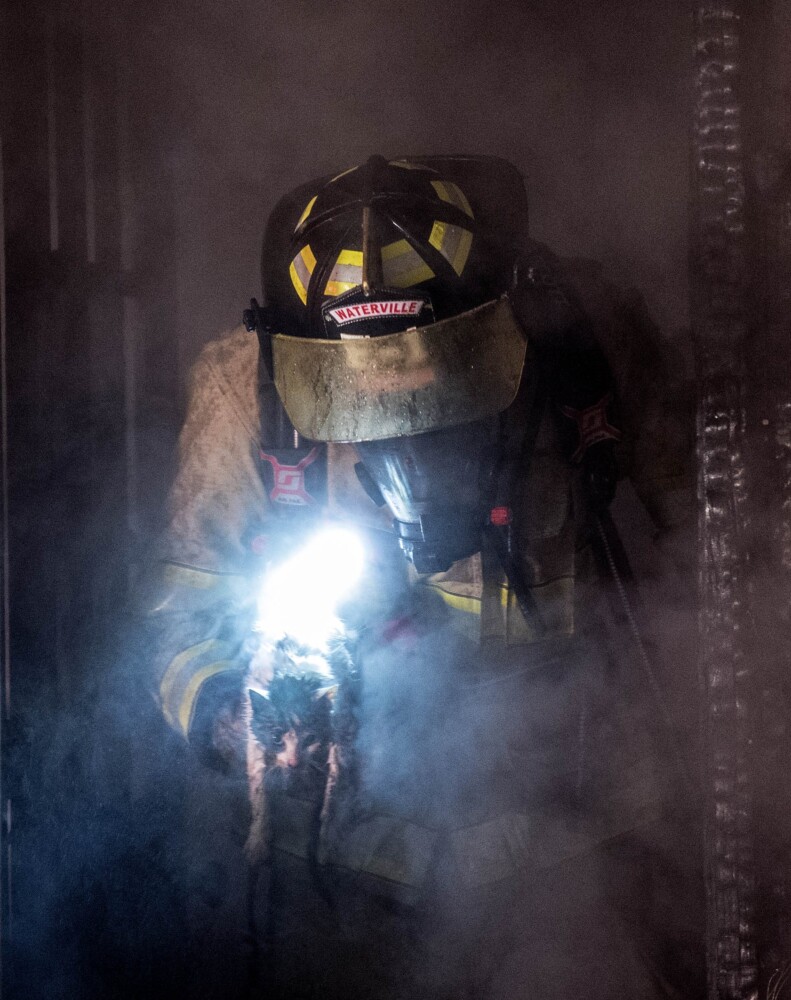 A firefighter from the Waterville Fire Department emerges from a burning structure with a live kitten on King Court in the South End of Waterville on Monday. Michael G. Seamans/Morning Sentinel