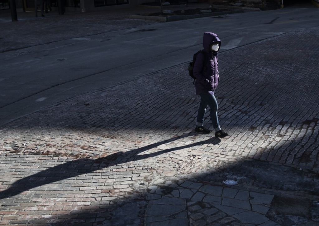 A woman walks through Monument Square in Portland on Friday. Derek Davis/Staff Photographer Buy this Photo