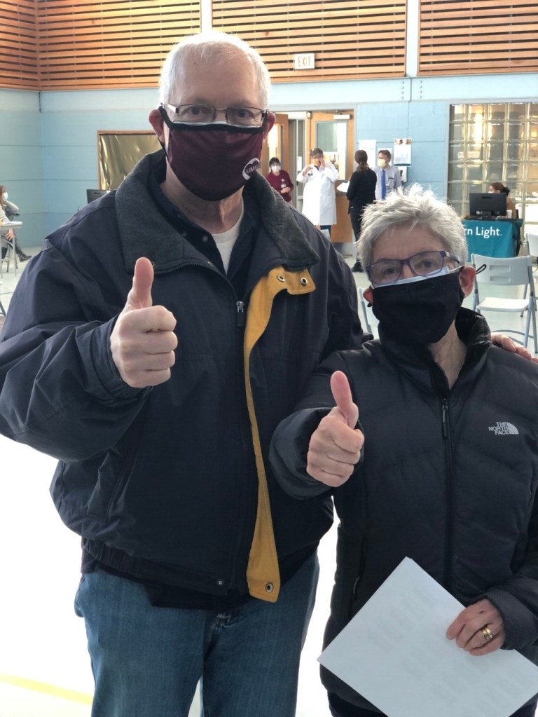 Ray and Connie Winship, retired teachers from Waterville, give thumbs-up Tuesday after receiving their first dose of COVID-19 vaccine at a clinic set up be Northern Light Inland Hospital at Kennebec Valley Community College in Fairfield. Northern Light Inland Hospital photo