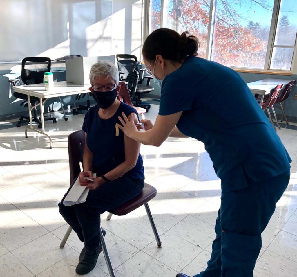 Registered nurse Jess Addy, right, administers a first dose of the COVID-19 vaccine Tuesday to Connie Winship, 72, of Waterville at a clinic set up by Northern Light Inland Hospital at Kennebec Valley Community College in Fairfield. Northern Light Inland Hospital photo
