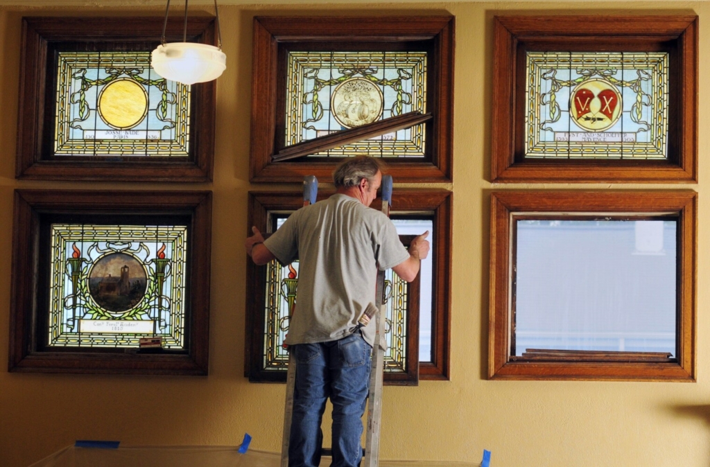 Pete Bolduc installs the last of the restored stained glass windows May 31, 2017, in the Lithgow Public Library reading room in Augusta. Bolduc has been missing since Monday. Joe Phelan/Kennebec Journal file
