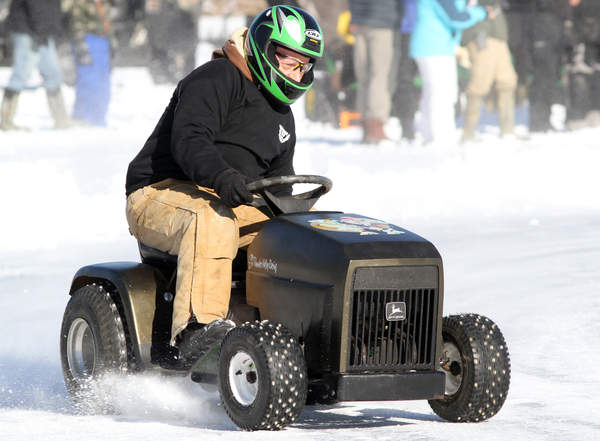 Thunder Valley Lawn Mower Drag Races organized Saturday’s event, just off the shore of Breezemere Park and Route 52/Norton Pond Road, which saw a handful of drivers bring their souped-up, former grass-cutting machines to slice their way around the ice.
