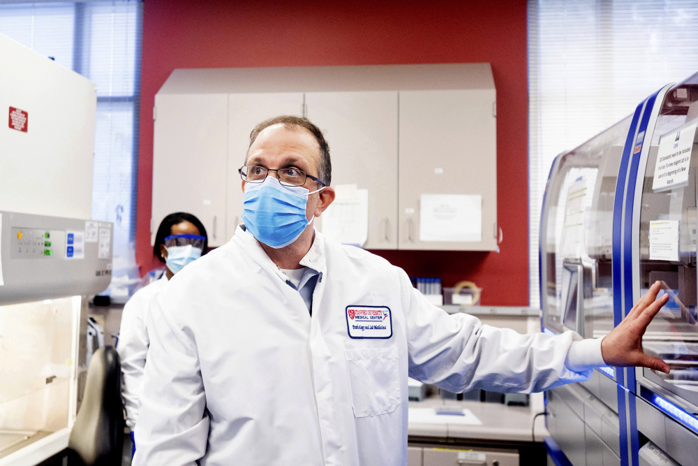 Dr. Benjamin Pinsky, medical director of the Stanford Clinical Virology Laboratory, explains how his lab processes upper respiratory samples from patients suspected of having COVID-19 on Wednesday in Palo Alto, Calif. Viruses mutate constantly. To stay ahead of the threat, scientists analyze samples for genetic changes, watching closely for ones that might make the virus more infectious or more deadly. Noah Berger/Associated Press