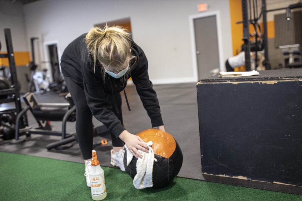 Colleen Drummey, 15, a student at Falmouth High, sanitizes a weighted ball after using it to work out at Beyond Strength. The gym lets 10 people work out in the building at once and has people register for their slots of time ahead of time online. Brianna Soukup/Staff Photographer