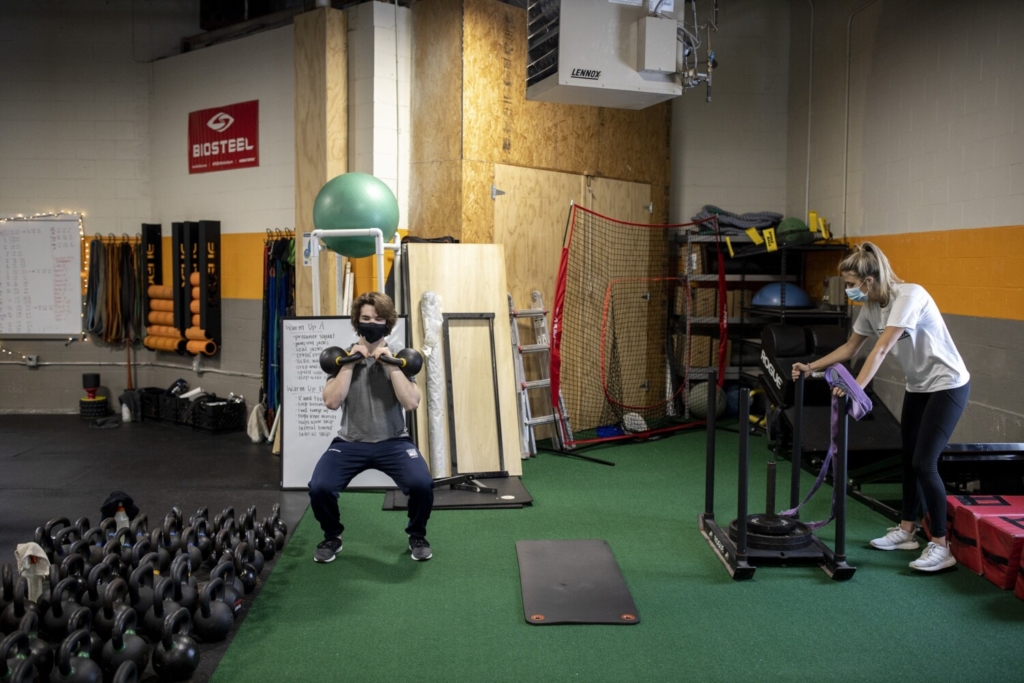 Herbie Bryant, left, 16, a hockey player for Portland High School, and Emma McCauley stay spaced apart as they work out at Beyond Strength in Falmouth on Jan. 29. Brianna Soukup/Staff Photographer