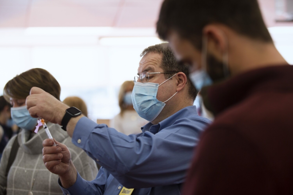 Dr. Logan Murray goes through the process of administering vaccines at a mass vaccination clinic at the former Scarborough Downs racetrack last week. Derek Davis/Staff Photographer Buy this Photo