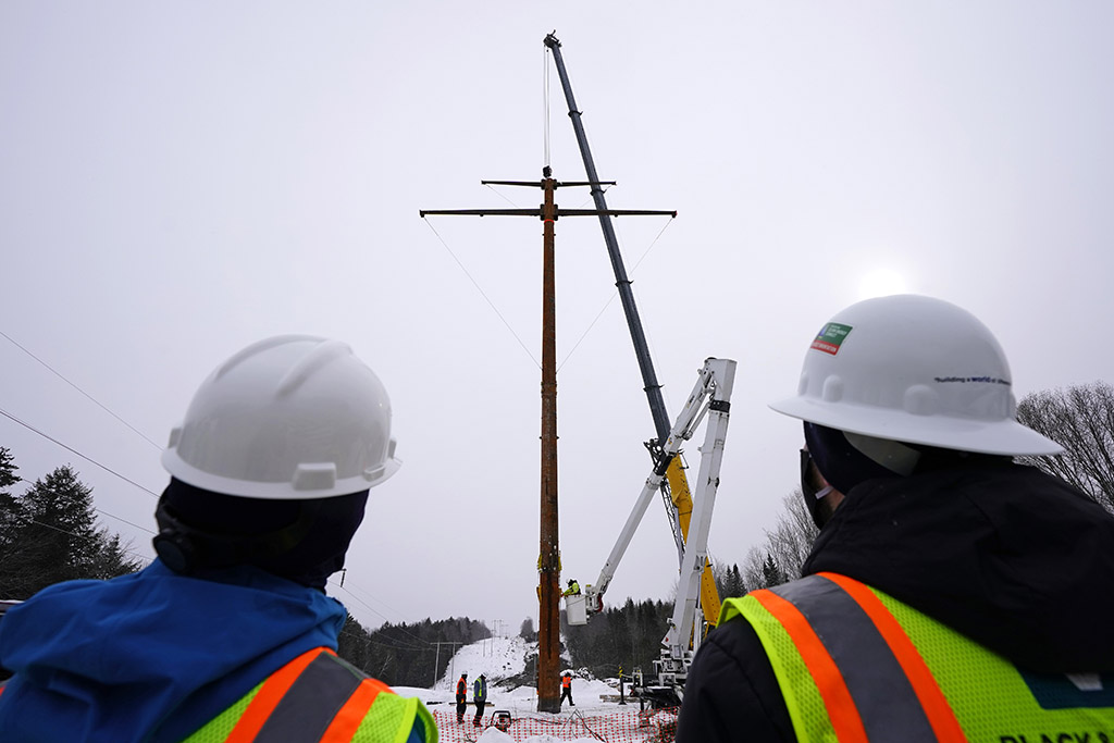 Workers watch the installation of the first pole of Central Maine Power’s hydropower transmission corridor Tuesday near The Forks. The pole was erected on an existing corridor that had been widened near Moxie Pond. Associated Press/Robert F. Bukaty
