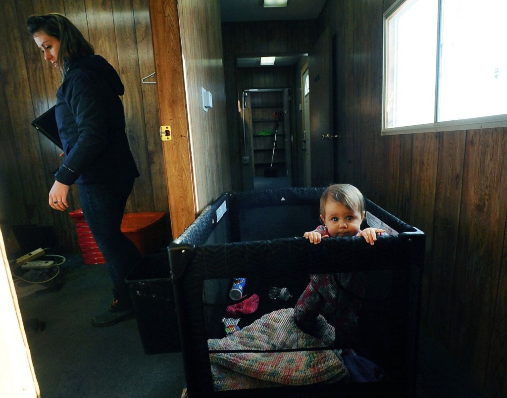 Bobbi Folsom works in her temporary accounting office Wednesday as her daughter, Ella, 10 months, stands nearby at Folsom’s Auto Sales, Service and Salvage. The business suffered heavy damage in a three-alarm fire that destroyed a building on Feb. 1. The offices and other components of the business are now housed at a trailer that was relocated to the business. Rich Abrahamson/Morning Sentinel Buy this Photo