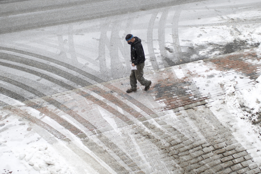 A pedestrian walks on Fore Street in Portland as light snow falls on Tuesday. Derek Davis/Staff Photographer Buy this Photo