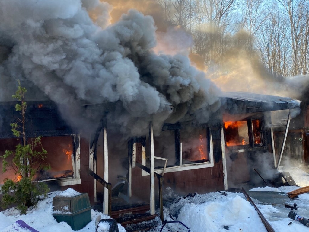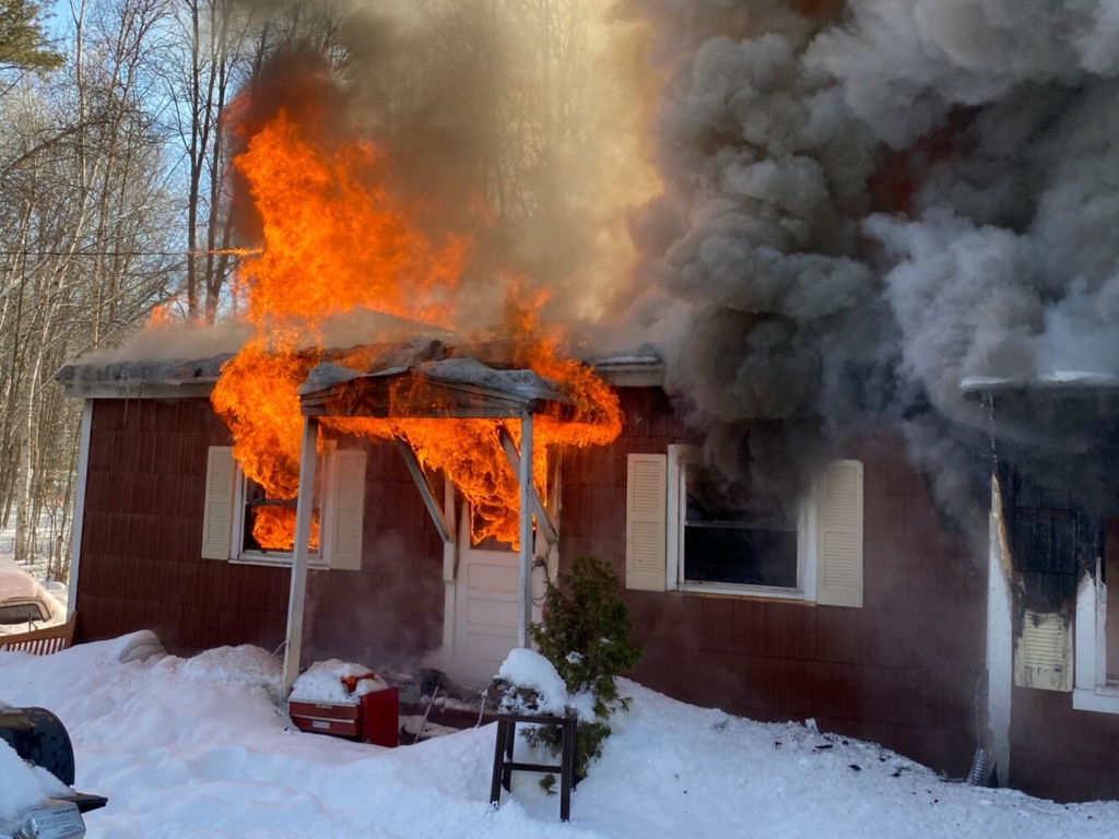 Flames consume the home of Kevin Whittemore on Wednesday morning at 313 Swan Road in New Sharon. Fire Chief John Welch said Whittemore told firefighters he was thawing a frozen pipe with an electric device, which is the suspected cause. Whittemore and his girlfriend escaped unharmed. Farmington Fire Rescue Department photo
