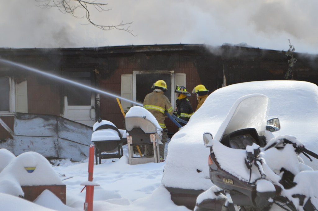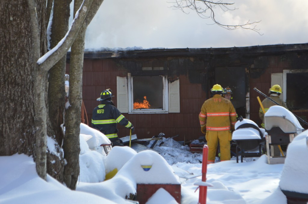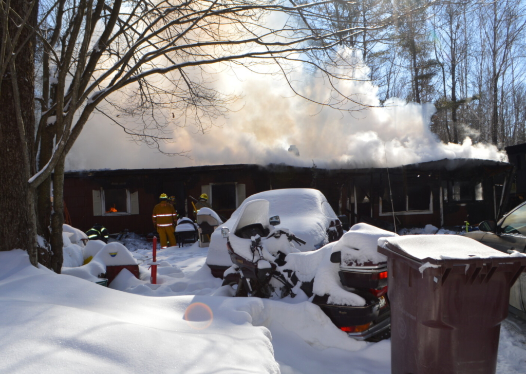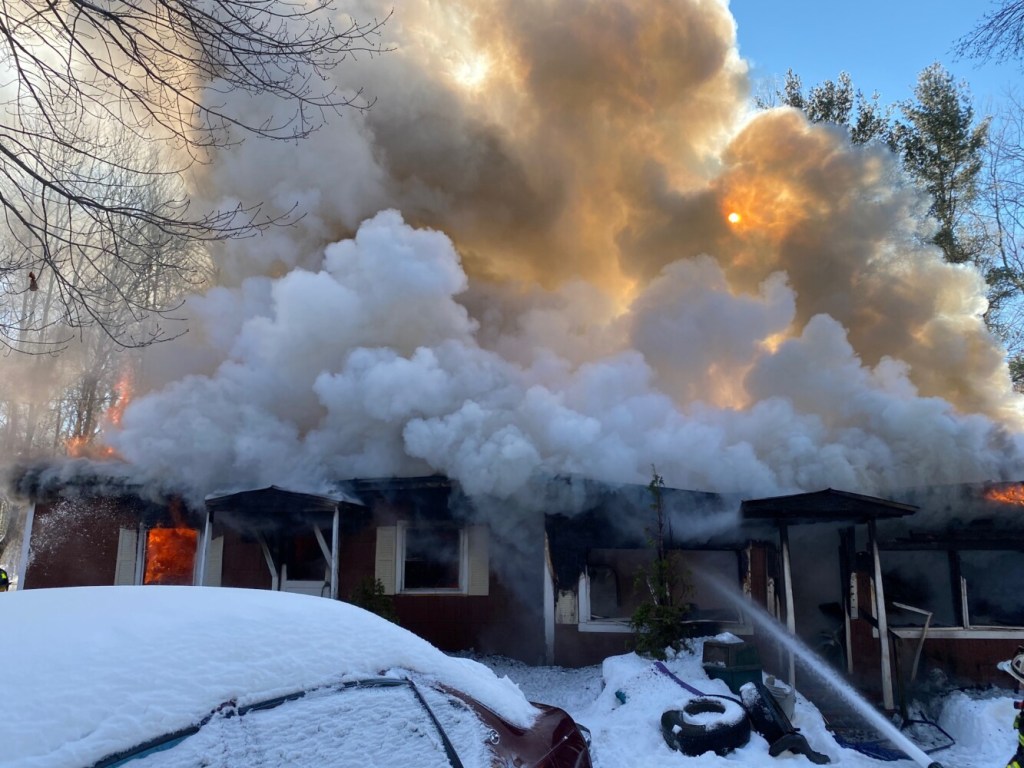 Flames and smoke fill the home of Kevin Whittemore on Wednesday morning at 313 Swan Road in New Sharon. Fire Chief John Welch said Whittemore told firefighters he was thawing a frozen pipe with an electric device, which is the suspected cause. Whittemore and his girlfriend escaped safely. Farmington Fire Rescue Department photo